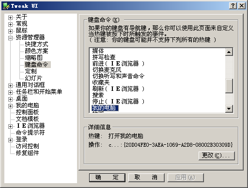 方法就是:下载一个叫TweakUI的小工具,然后在左边选择资源管理器,展开下面的键盘命令,然后就可以定义快捷键了囧
