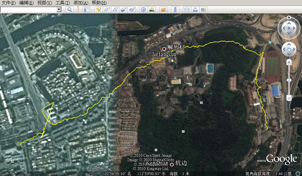 看图可以发现,对于步行来说1hz过于频密,路线锯齿比较严重。看来步行还是用5秒记录一次足够了。图的右半边,不知道是不是因为Google地图的拼合问题,还是因为m-241本身的问题,在这里出现了十来二十米的漂移。但是方向转为南北方向后,漂移又没有了。