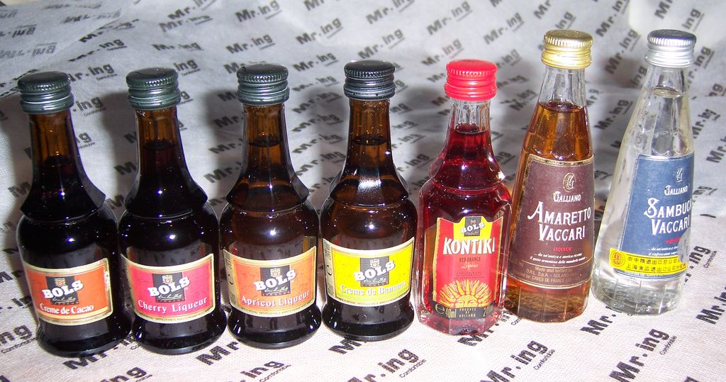 左起:bols的咖啡、樱桃、杏仁、香蕉、红橙力娇酒,加力安奴的阿梅力图、森巴加力娇酒。